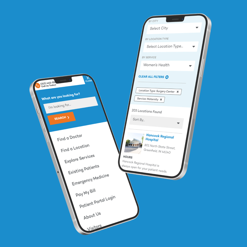 Web design for Hancock Health’s new site was all about streamlining UX/UI by providing clear choices to help people find the information they need, quickly. That included welcoming, concise, easy-to-understand copy throughout the design, complemented by familiar visuals that reinforce the Hancock brand. And because so many people are accessing healthcare websites and apps on their phones, we knew the site needed to perform seamlessly regardless of screen size—so we optimized everything for mobile.
