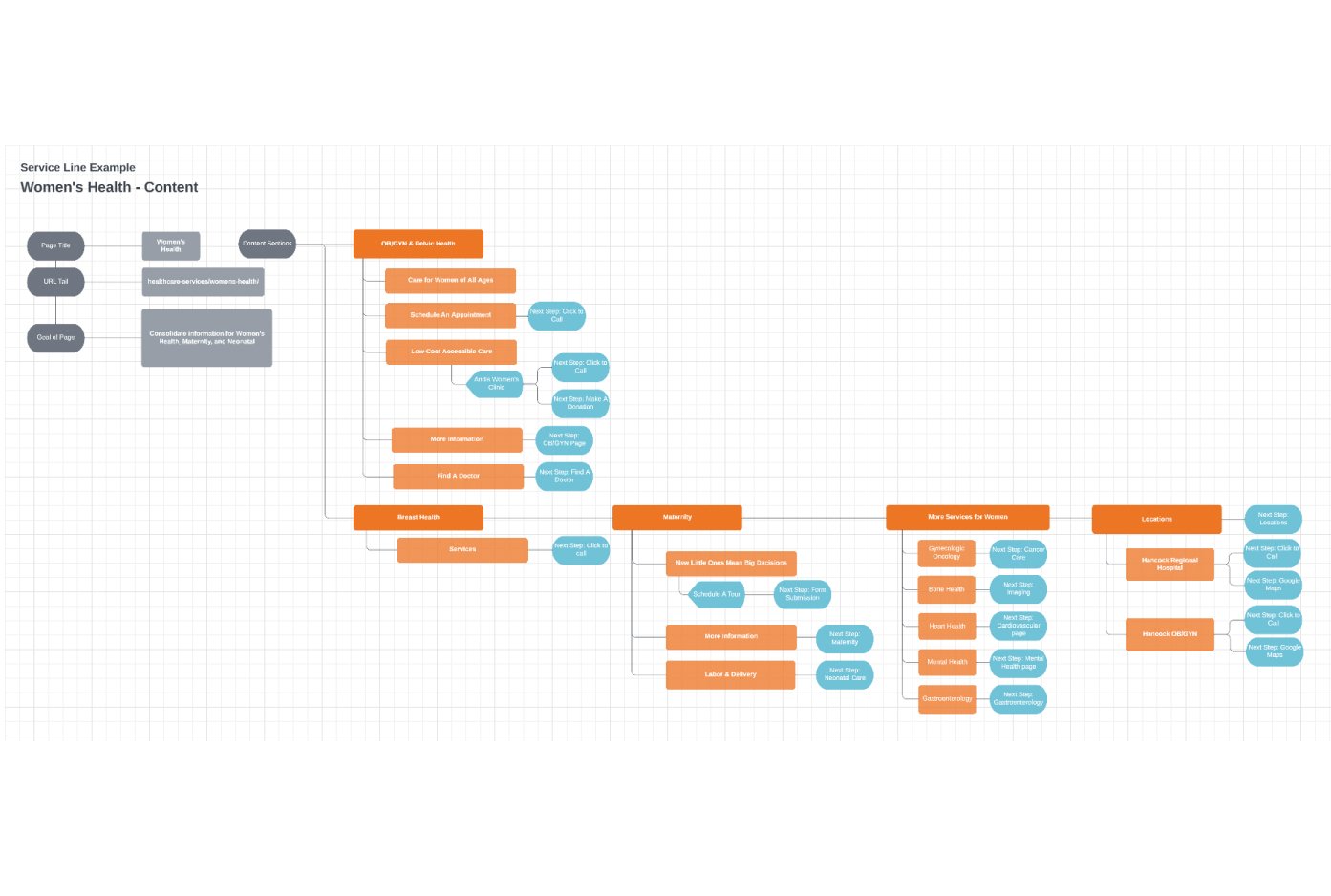 We used our research findings to make detailed audience personas helping us predict how people search for healthcare information (both online and otherwise) and make decisions about care. We took into account not only the experience of current Hancock Health patients, but also prospective patients who might be exploring their healthcare options—or simply wanting reliable information about health conditions. In addition, we created customer journey maps documenting every online and real-life patient touchpoint throughout the healthcare network and greater community. These journey maps gave us a better understanding of a person’s emotional state as they experience what Hancock Health has to offer. This knowledge directly informed our website strategy, which focused on enhancing clarity and functionality while satisfying the needs of different kinds of visitors (i.e., patients, prospective patients, healthcare information seekers, etc.).