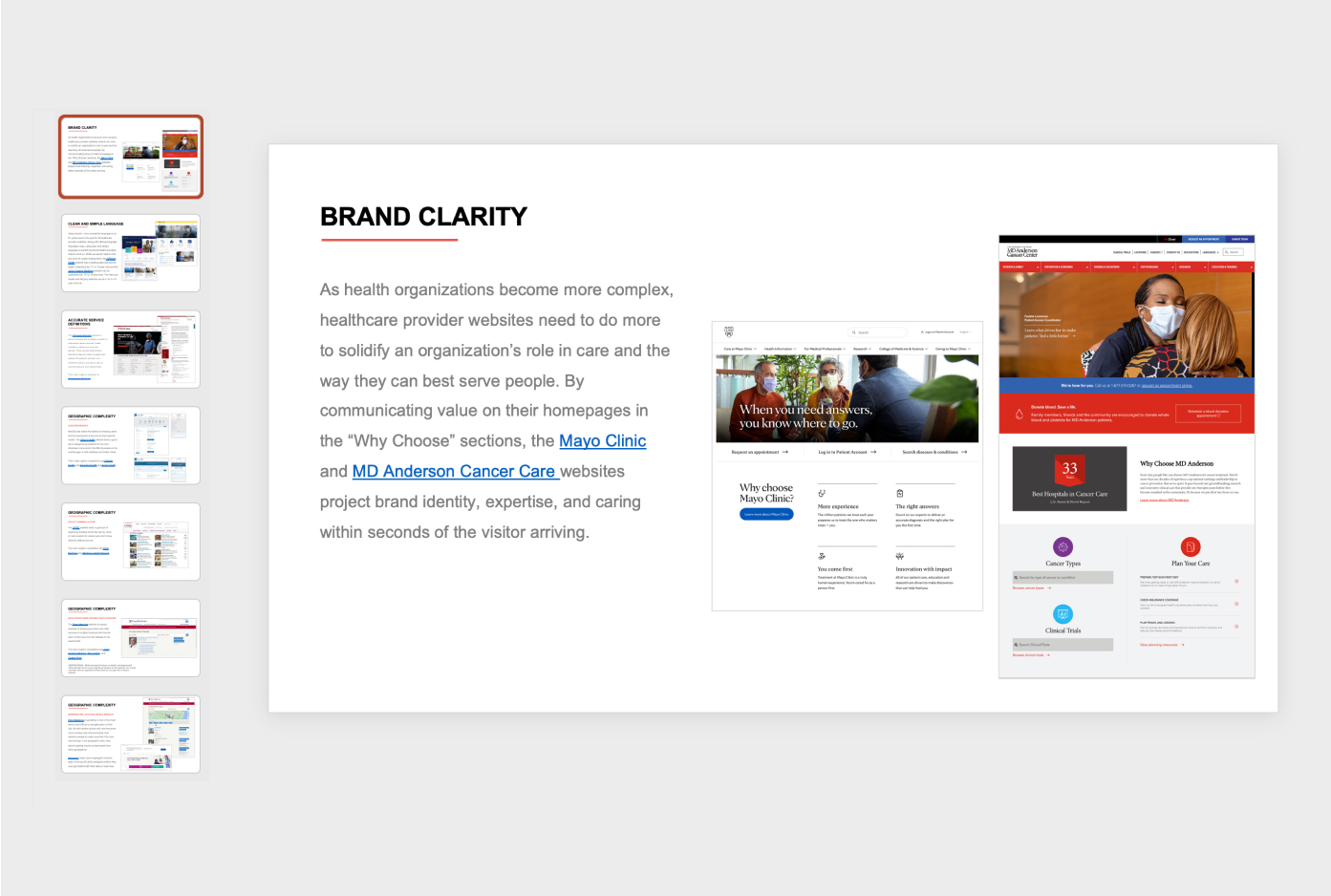 A deep dive into both industry and market research helped us understand what people really want out of a regional healthcare network like Hancock Health. We discovered the most important things are access to physicians, proximity to healthcare facilities, convenience, and insurance coverage. Our research involved benchmarking against competitors—including top hospitals—to help determine which website improvements would have the biggest impact. And it included taking a close look at existing user data about Hancock Health’s various websites to identify and understand patterns that helped inform our work.