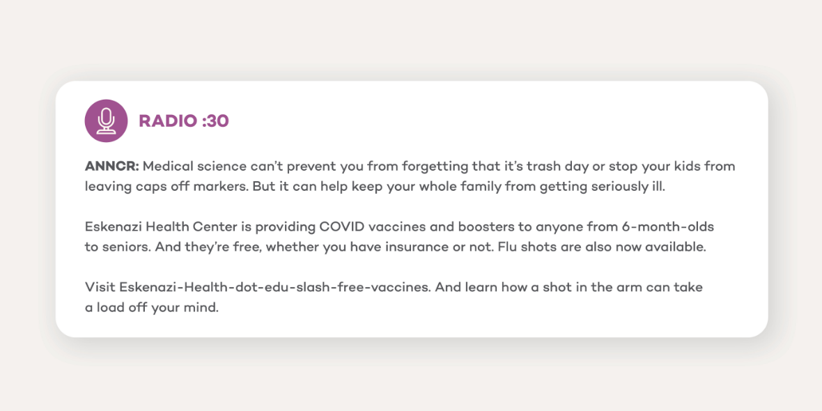 The campaign we created for Eskenazi Health urged people to “prevent the worries you can,” by visiting the network’s health centers to get a vaccination or booster shot to protect themselves and their families against COVID (and flu, during winter months). We started by creating a landing page on EskenaziHealth.edu that helped visitors find nearby vaccine locations. We told them what to bring with them and let them know what to expect once they got there. We offered information on vaccines and provided answers to frequently asked questions—clearing up confusion and correcting misinformation.