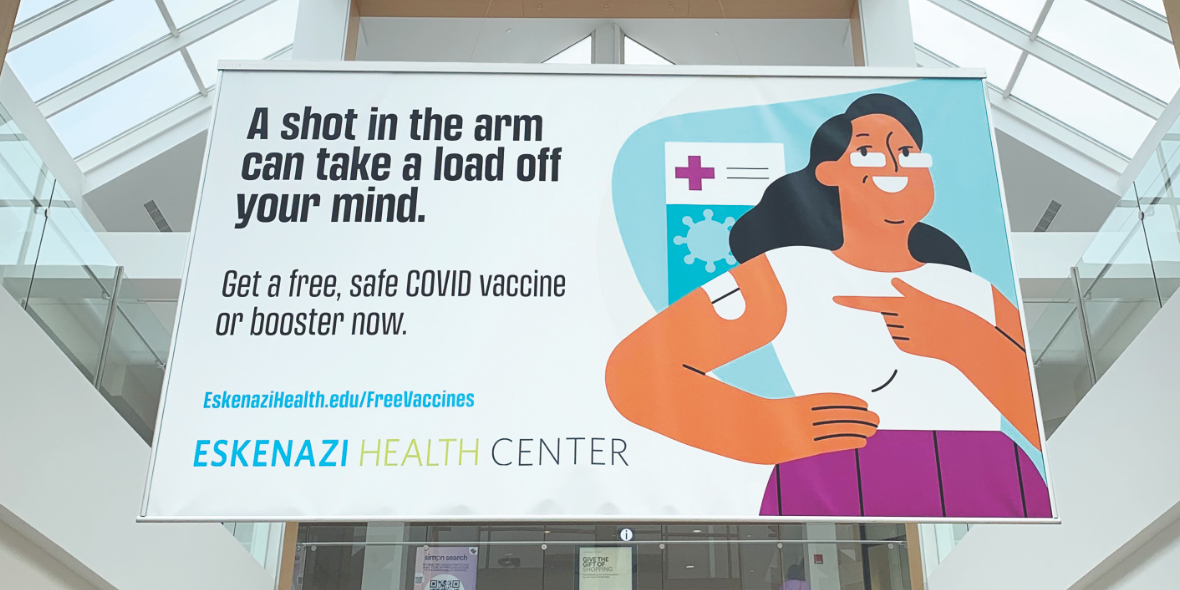 We used other media—ranging from print ads to brochures to banners both digital and literal—to remind audiences that Eskenazi Health offered COVID vaccines and boosters for everyone from 6-month-olds to seniors.